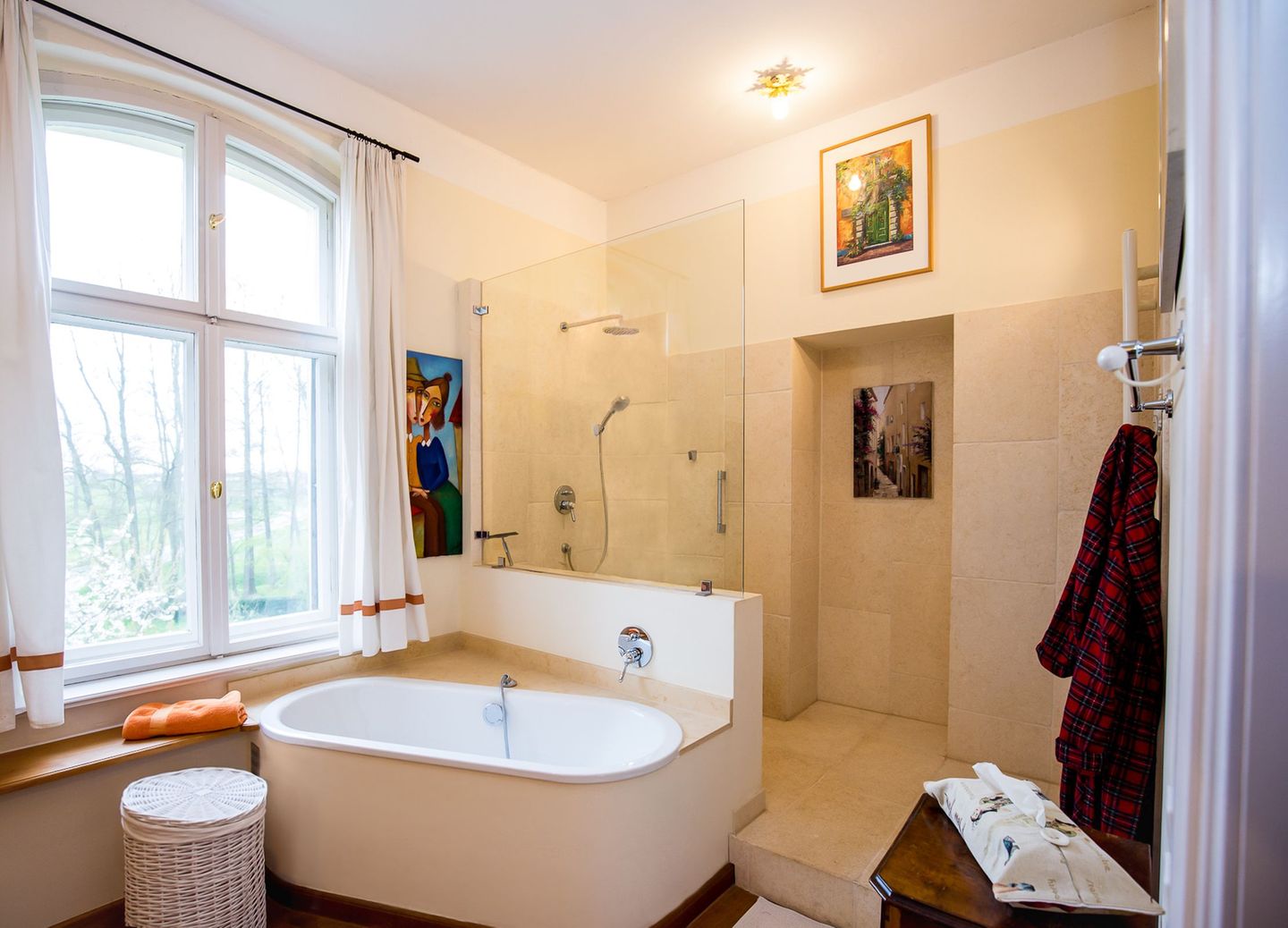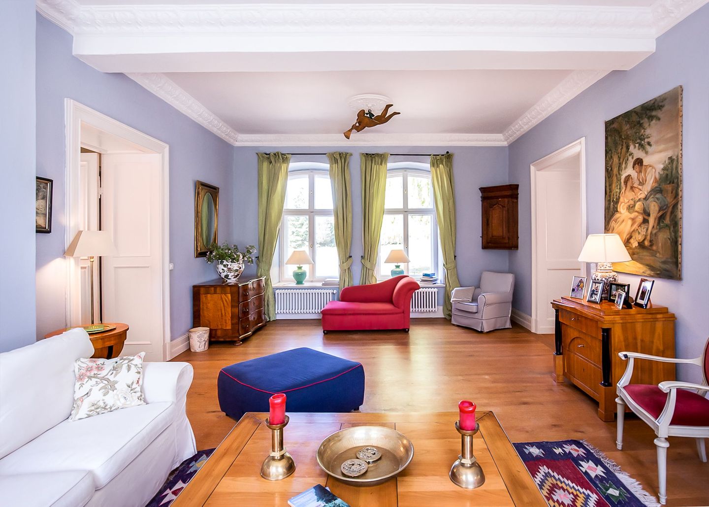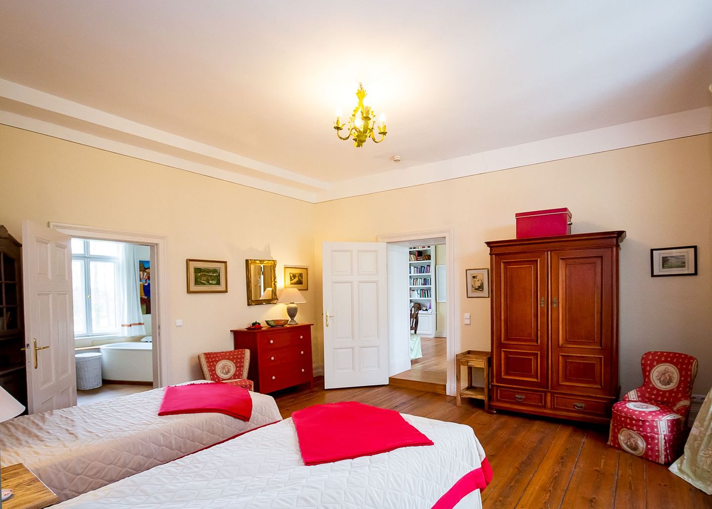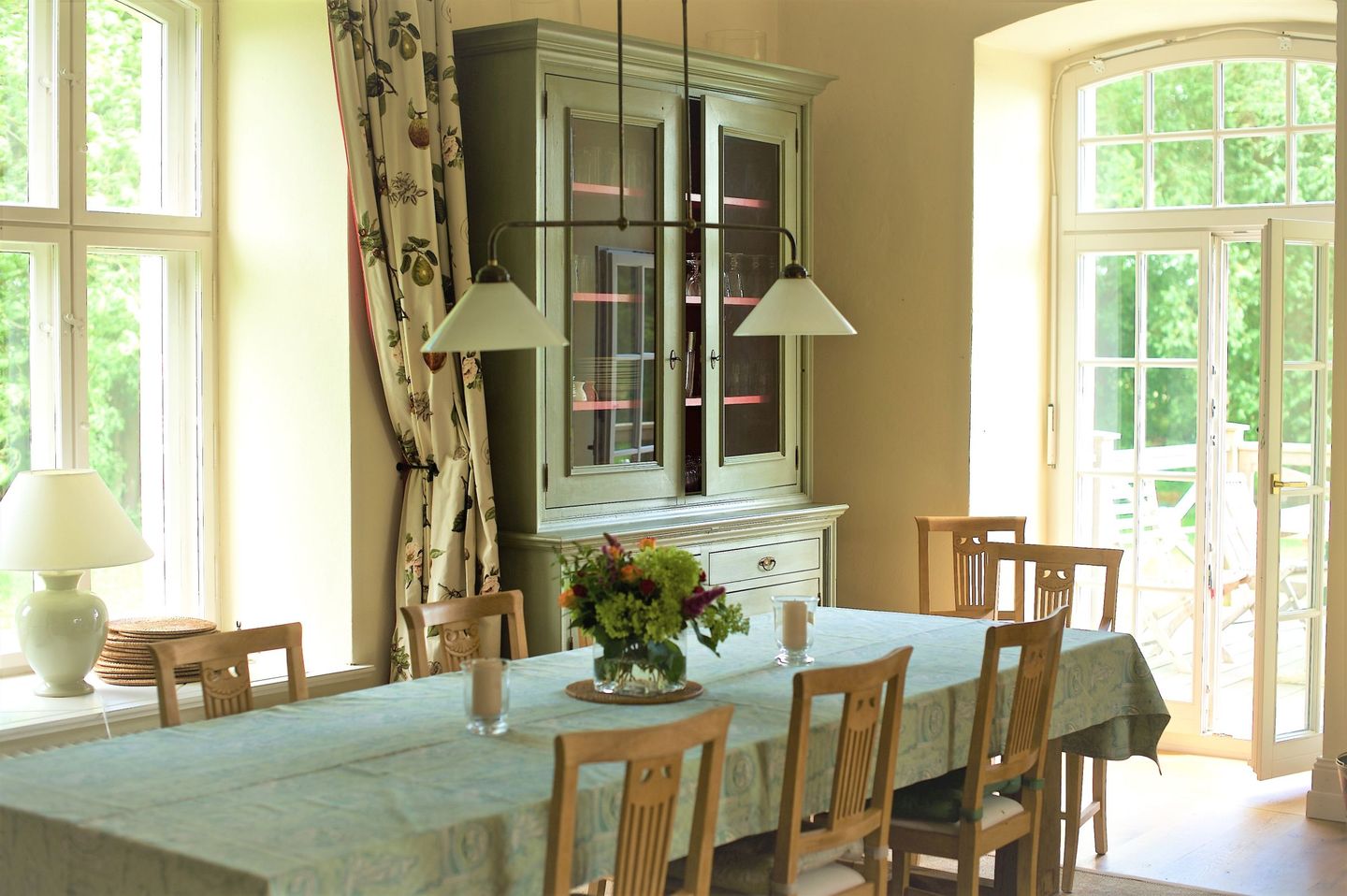 Fingerspitzengefühl renoviert und modernisiert. Die alten Fußböden wurden aufgearbeitet, alte Farbkonzepte übernommen, Türen und Fenster entweder aufgearbeitet oder nach historischem Vorbild nachgebaut. Der historische Charme ist überall zu spüren. Mit seinen zwei Wohnzimmern und zwei Kaminen, der großzügigen Wohnküche, den vielen Schlafzimmern und Bädern eignet sich das Haus ideal für Großfamilien, die Zeit miteinander verbringen wollen, oder Gruppen,