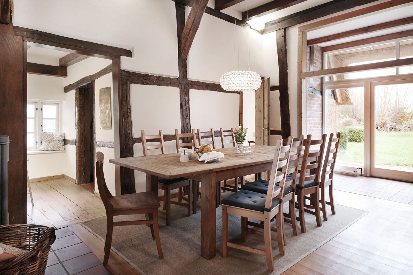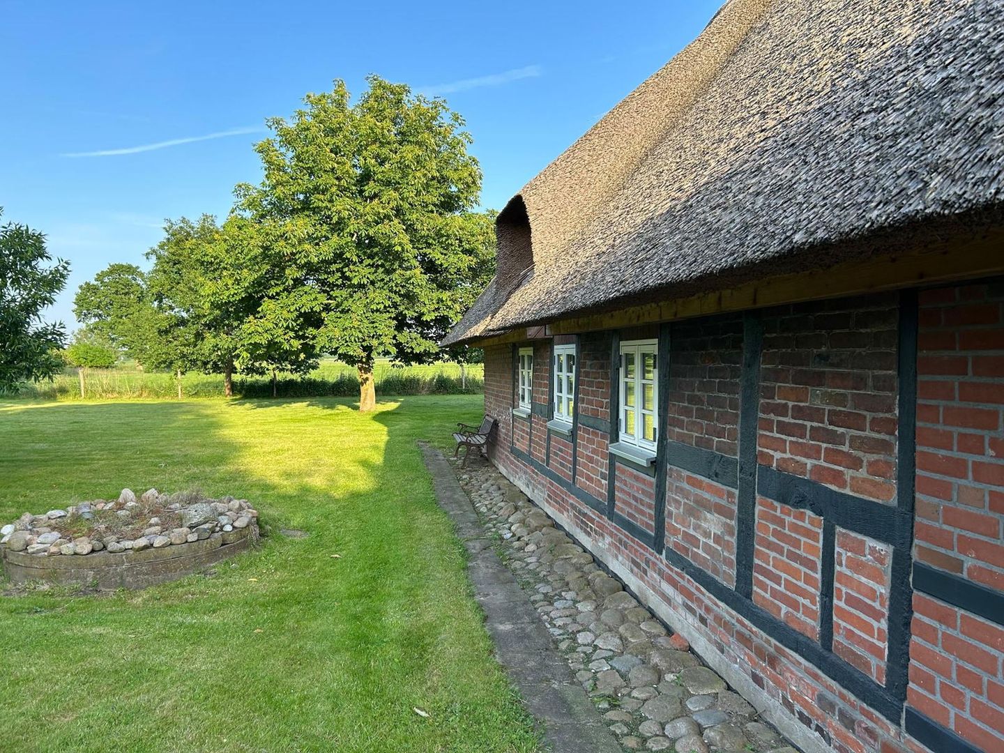 Das historische Fachwerkhaus verbindet traditionellen Landhauscharme mit einer gemütlichen, stilvollen Einrichtung. Hier können Sie den Alltag hinter sich lassen, den Duft von frisch gemähtem Gras genießen und abends bei einem Glas Wein den Sonnenuntergang über den Feldern bestaunen.