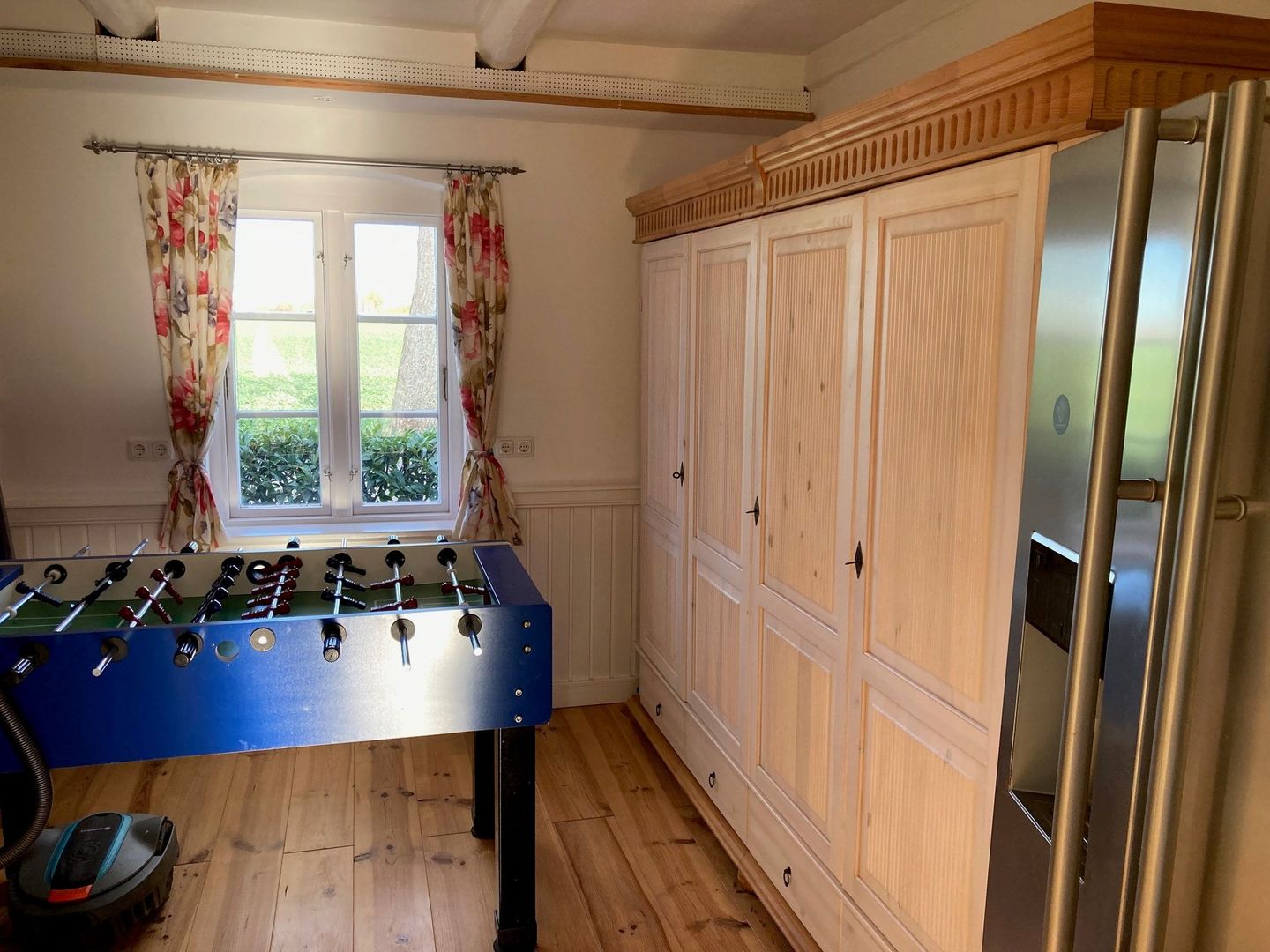 Ein Tischkicker sorgt für zusätzliche Unterhaltung – ideal für gemeinsame Abende mit Familie oder Freunden.