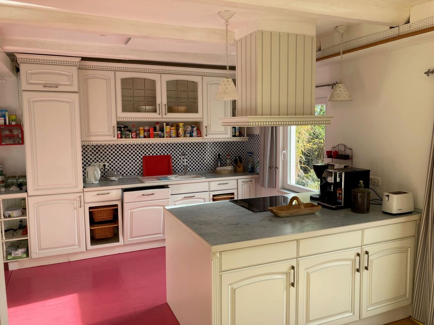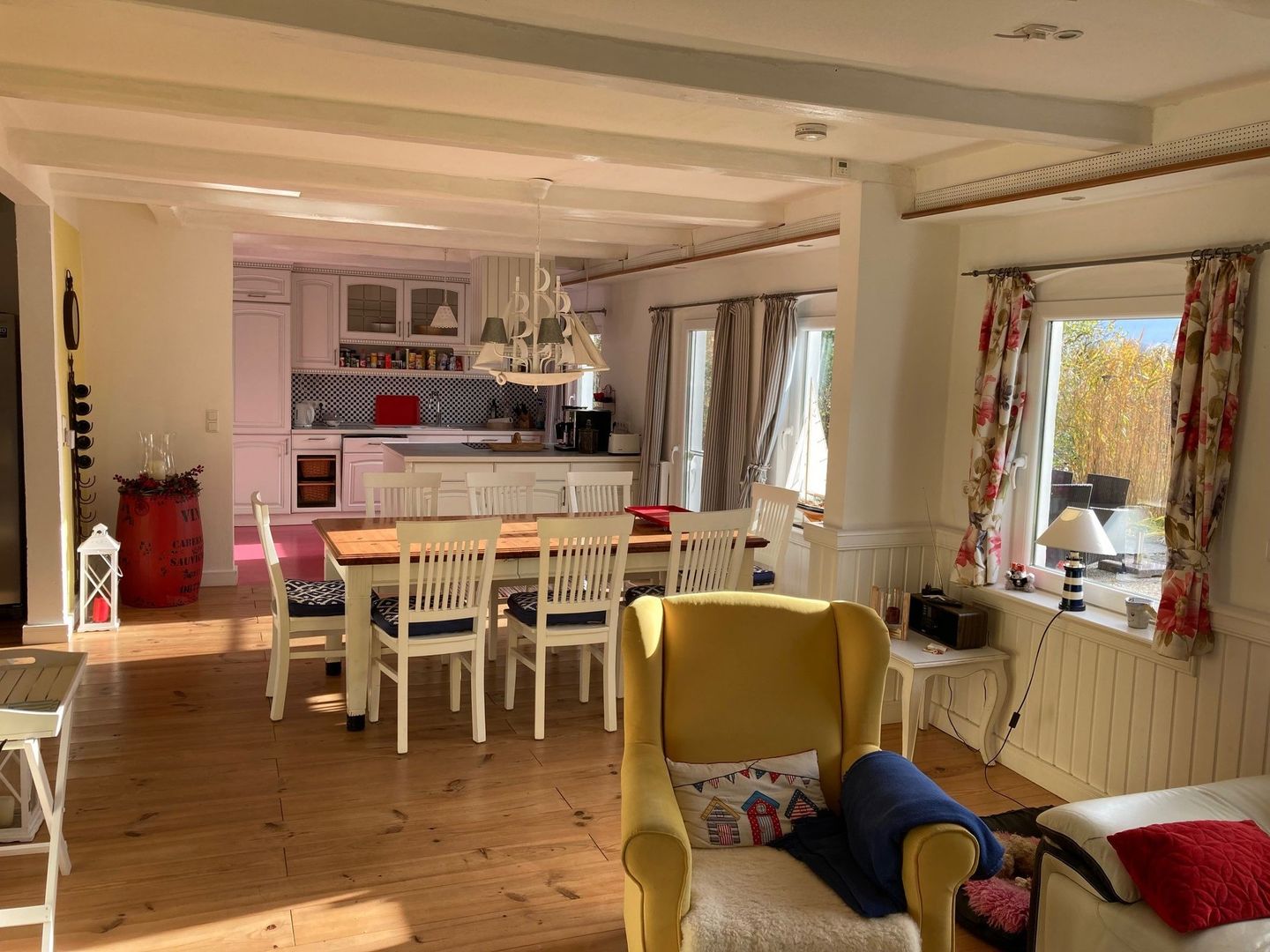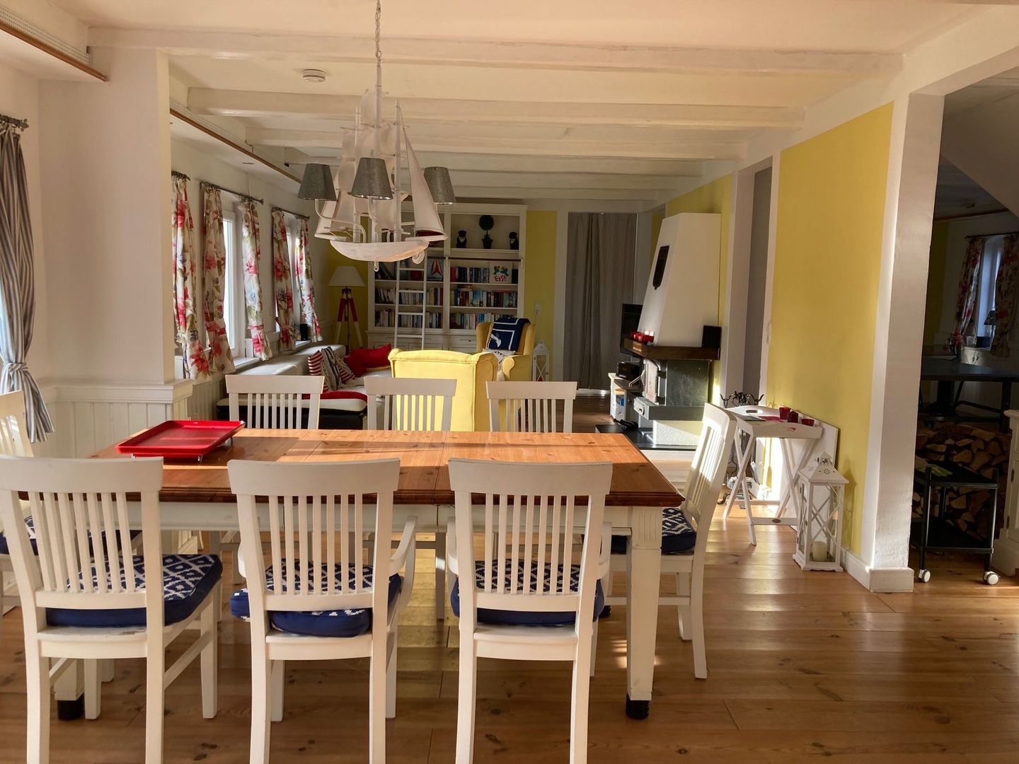 Im Mittelpunkt steht die großzügige, offen gestaltete Küche mit vollständiger Ausstattung. Der Wohnbereich mit Kaminofen lädt zu entspannten Stunden ein, während der Blick aus den Fenstern über die umliegenden Felder schweift. Der große Garten bietet viel Platz zum Entspannen und Spielen.